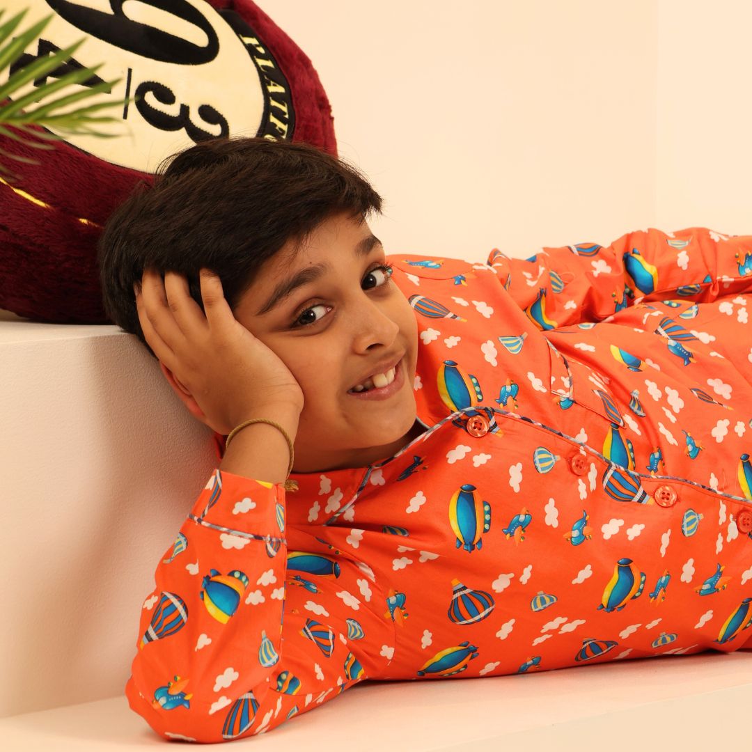 Let your dreams take flight with the Tuck and Tots Up and Away Nightsuit! Designed with cheerful hot air balloons and puffy clouds, this breezy set is a bedtime favorite for kids and moms alike. Made from soft, breathable cotton, it's perfect for cozy sleepovers, snuggly mornings, and every dreamy moment in between